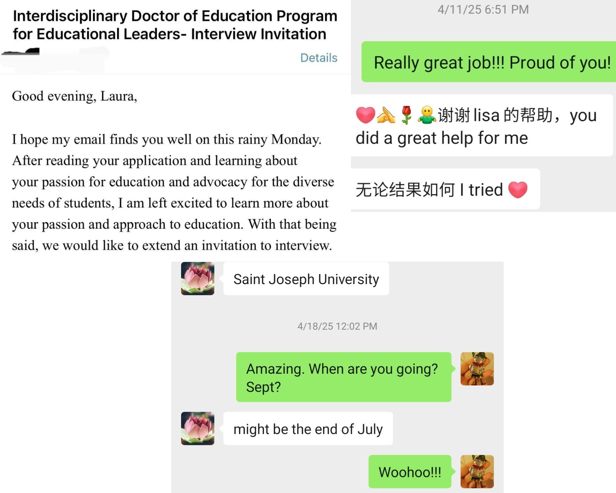 “Lisa, great news—I just got a PhD interview!”